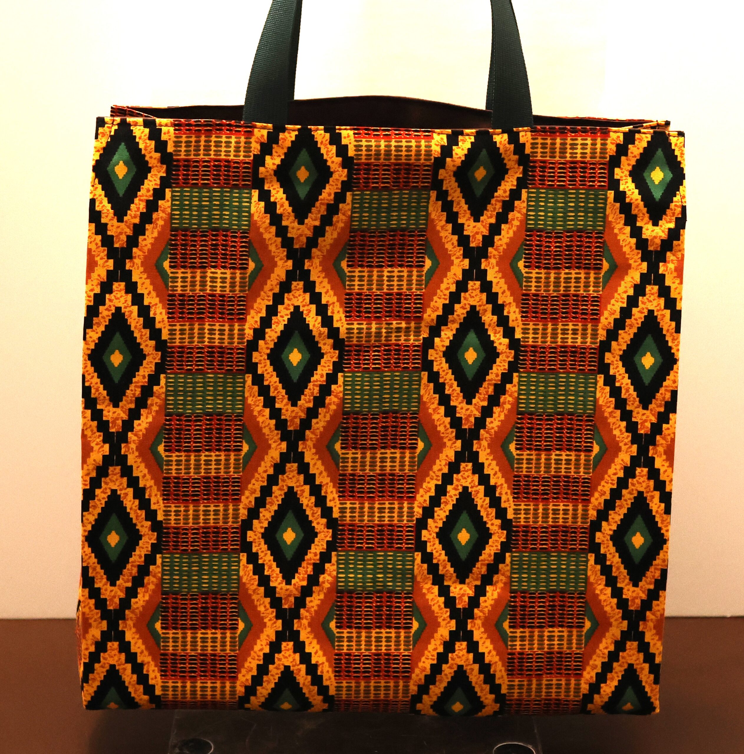 I absolutely LOVE the primitive design of this fabric. It is definitely an attention getter! This tote has an all cotton exterior & lining with a zippered pocket and a complementary charm embellishment on the zipper pull. The straps are strong, durable and measure approximately 19 inches. Each tote comes with a removable foam core board for the bottom of the bag to stabilize it if needed. This bag is machine washable, but I recommend drying the bag flat and pressing it lightly.